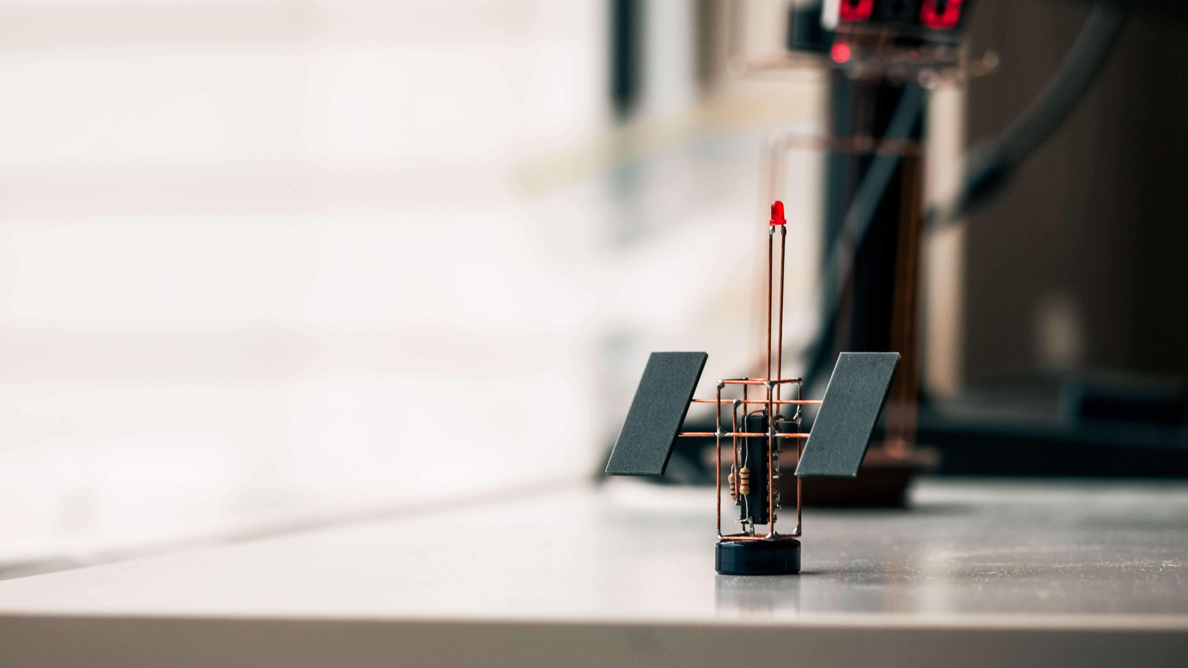 For this sculpture, I used 0.8mm brass wire for the structure, and I’m pleased with the results. The only other key design feature is the blinking LED that extends from the top of the satellite. 2Sat has a total height of ~85mm, with the body + capacitor measuring at 45mm high, and the LED extending 40mm.